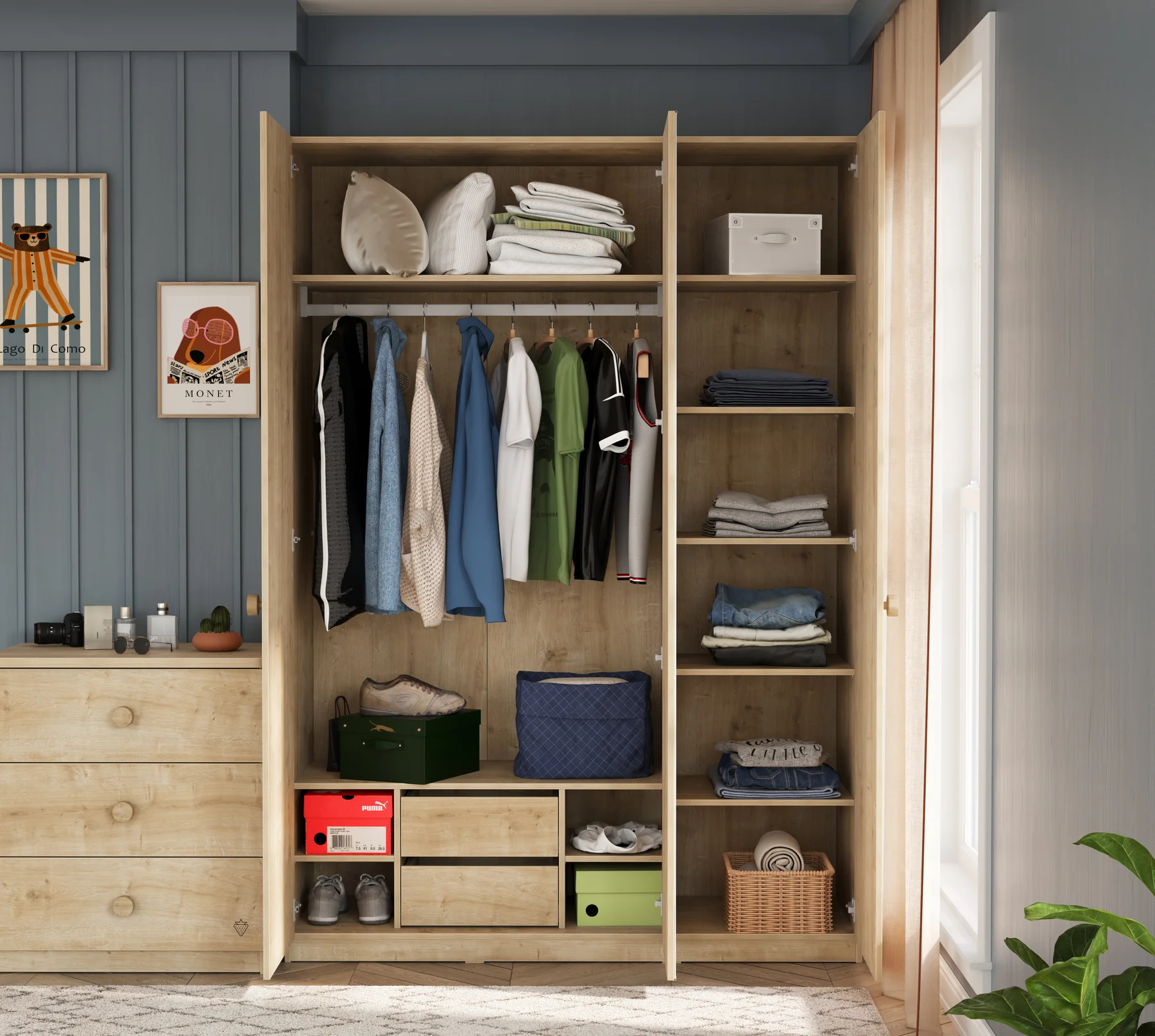 Großzügiges Platzangebot: Hinter den drei Türen verbirgt sich ein durchdachtes Innenleben. Zahlreiche Regalfächer bieten ausreichend Platz für gefaltete Kleidung, während die integrierte Kleiderstange für Ordnung bei Hemden, Jacken und Kleidern sorgt.