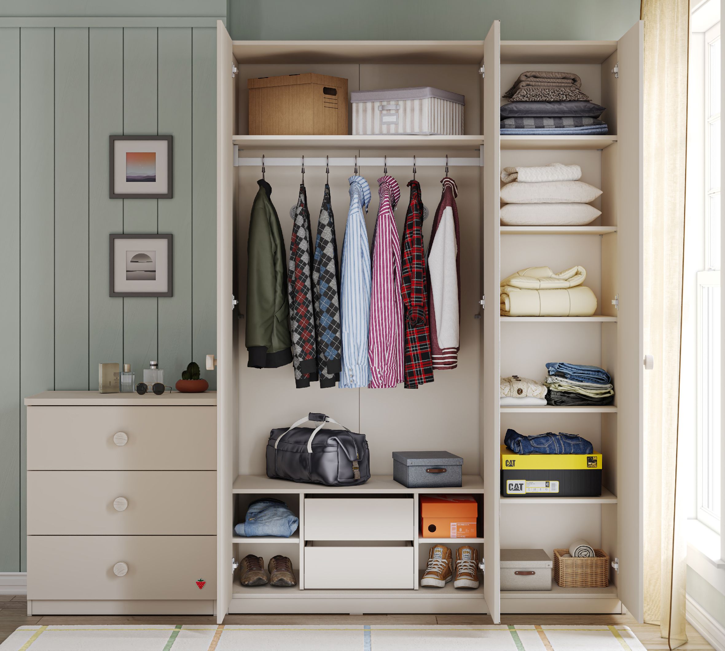 Der Cilek Varia Kleiderschrank überzeugt mit einer beeindruckenden Größe von 150 x 214 x 62 cm (B/H/T) und einer cleveren Innenaufteilung, die keine Wünsche offen lässt. Die mittlere der drei Türen ist mit einem großen, eleganten Spiegel versehen. Dieses Feature ist nicht nur praktisch für das tägliche Ankleiden, sondern lässt kleine Räume optisch größer und heller wirken – ein echtes Highlight im Kinderzimmer oder Jugendzimmer.