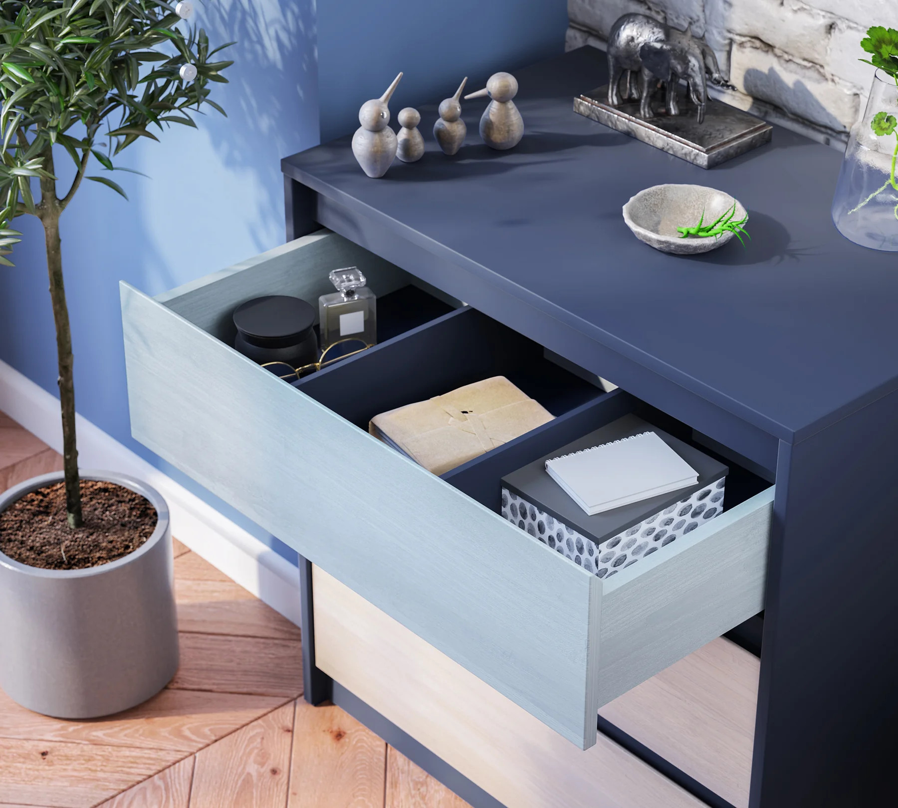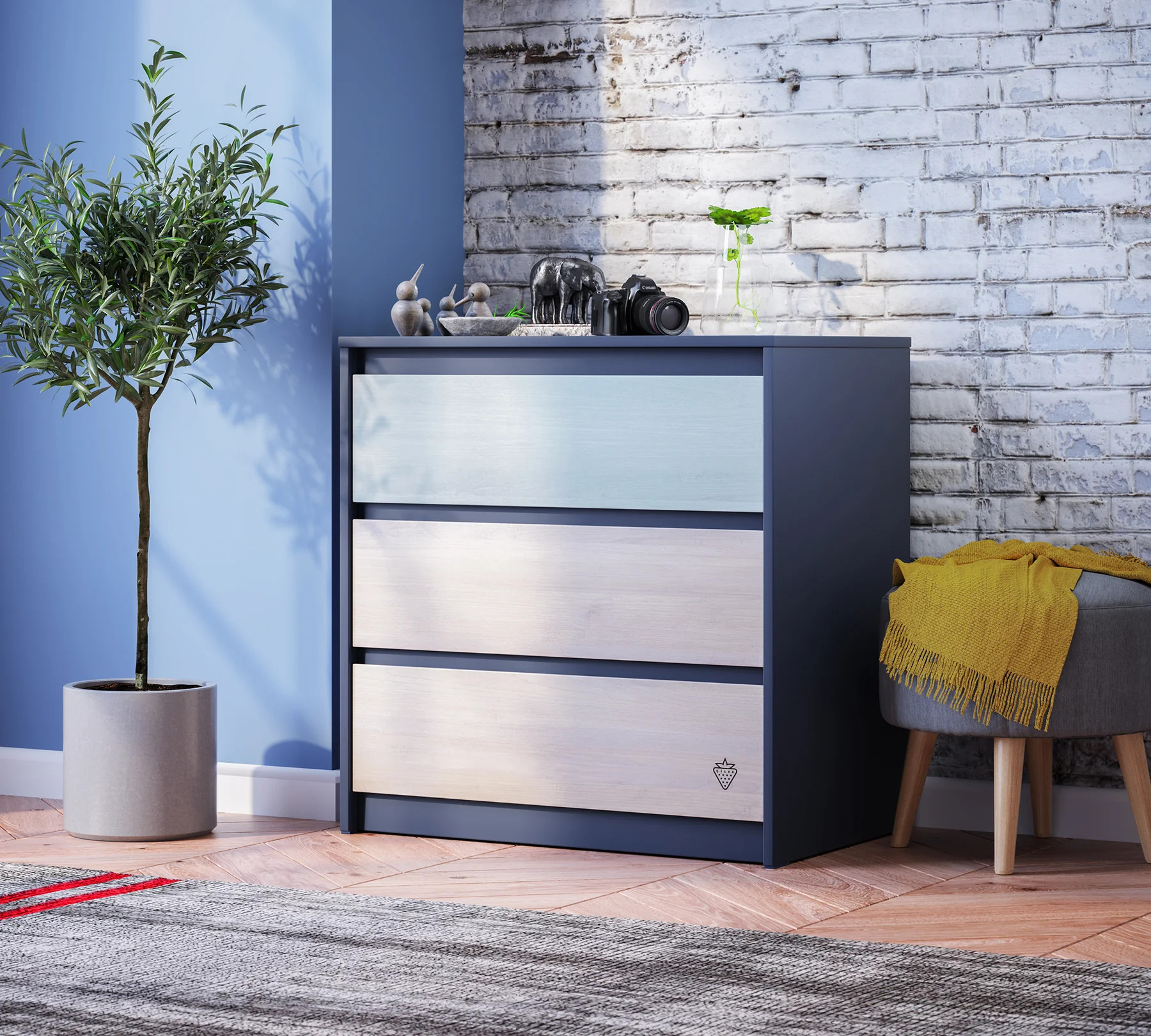 Die Trio Kommode überzeugt durch ihre klare Linienführung und eine harmonische Farbkombination aus Naturtönen (Holzoptik), modernem Hellgrau und dezenten dunkelblauen Akzenten.