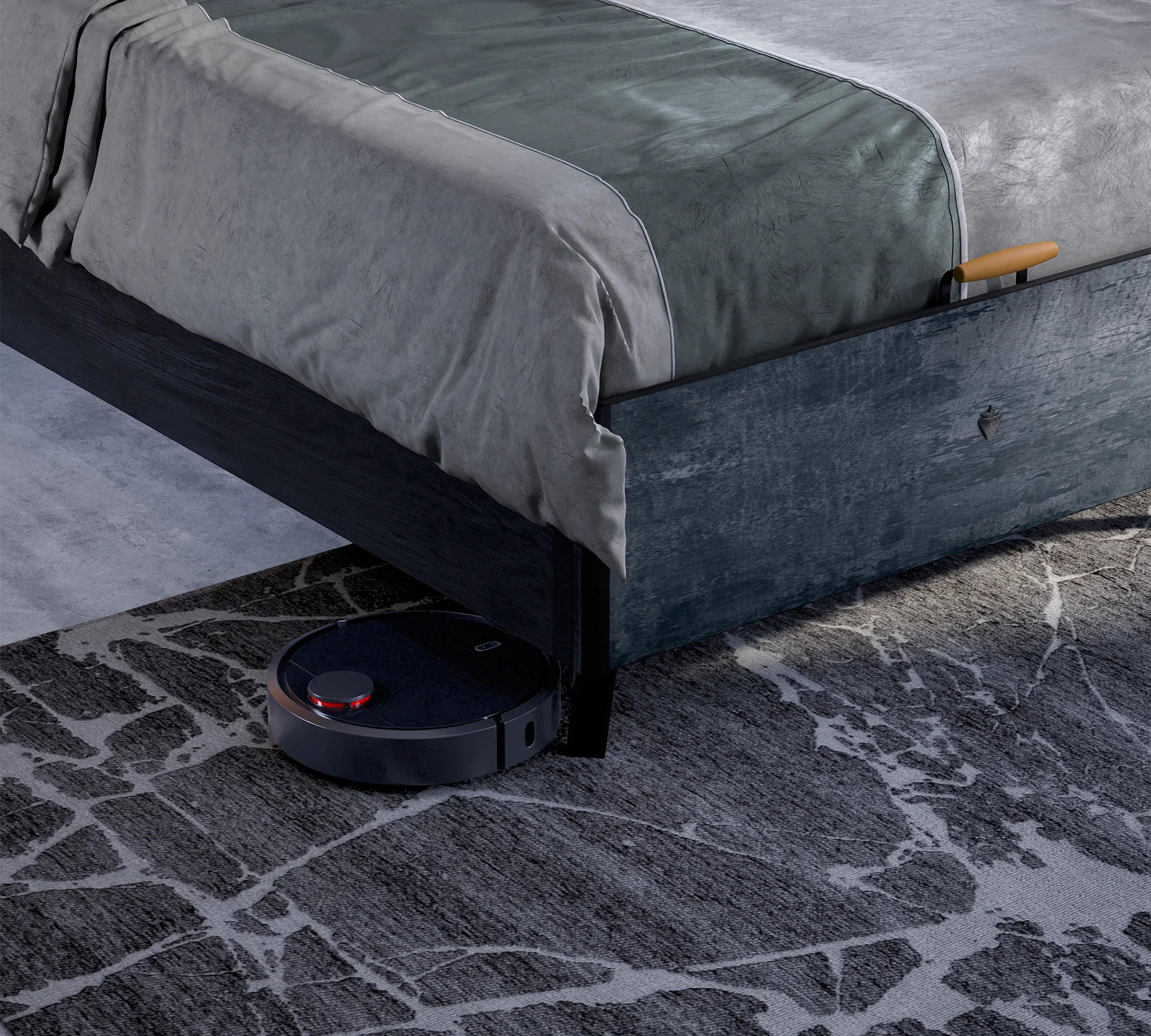 An alles gedacht: Im Kopfteil ist eine USB-Ladestation integriert, sodass Smartphone oder Tablet über Nacht bequem direkt am Bett geladen werden können. Zudem bieten praktische Seitentaschen am Kopfteil sowie ein dekorativer Reißverschluss Platz für Kleinigkeiten wie Ladekabel, Fernbedienung oder die Lieblingslektüre. Die markante Farbkombination aus dunklen Grautönen und tiefem Schwarz verleiht dem Raum eine coole, erwachsene Atmosphäre. Das absolute Highlight ist das handgefertigte Kopfteil aus hochwertigem Kunstleder. Mit seinen groben Nähten und dem Metallgestell setzt es optische Akzente, während die weiche Polsterung für maximalen Komfort beim Lesen oder Streamen sorgt.