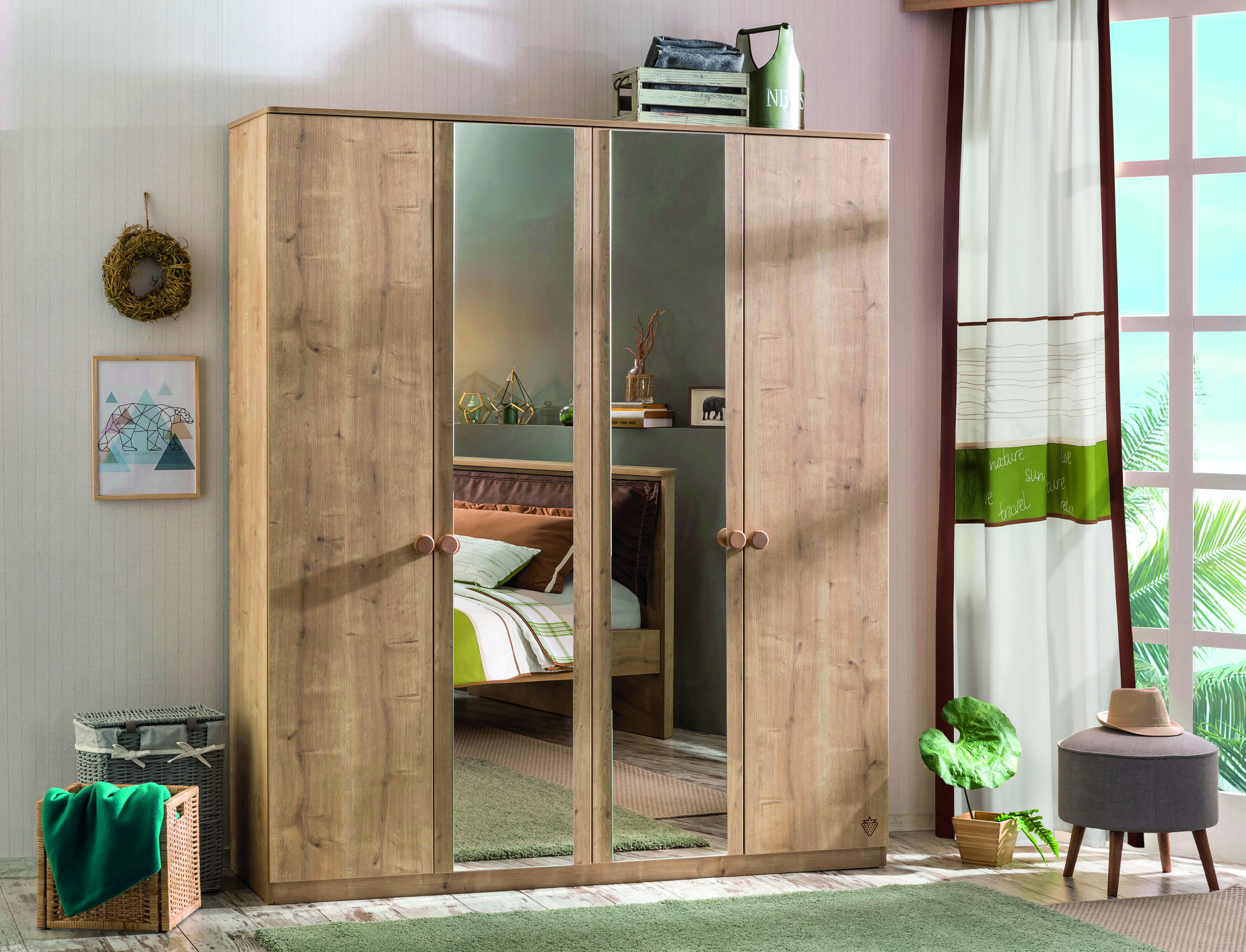 Jede Menge Stauraum bietet dieser Kleiderschrank mit vier Türen, von dem 2 komplett verspiegelt sind. Das natürlich anmutende Holz passt nicht nur zu rustikal eingerichteten Zimmern, sondern kann auch als besonderer Blickfang mit anderen Möbelstücken kombiniert werden. Ein richtiges Highlight ist die beleuchtete Kleiderstange die auch am frühen Morgen, wenn es noch etwas dunkler ist, für einen hellen Überblick sorgt.