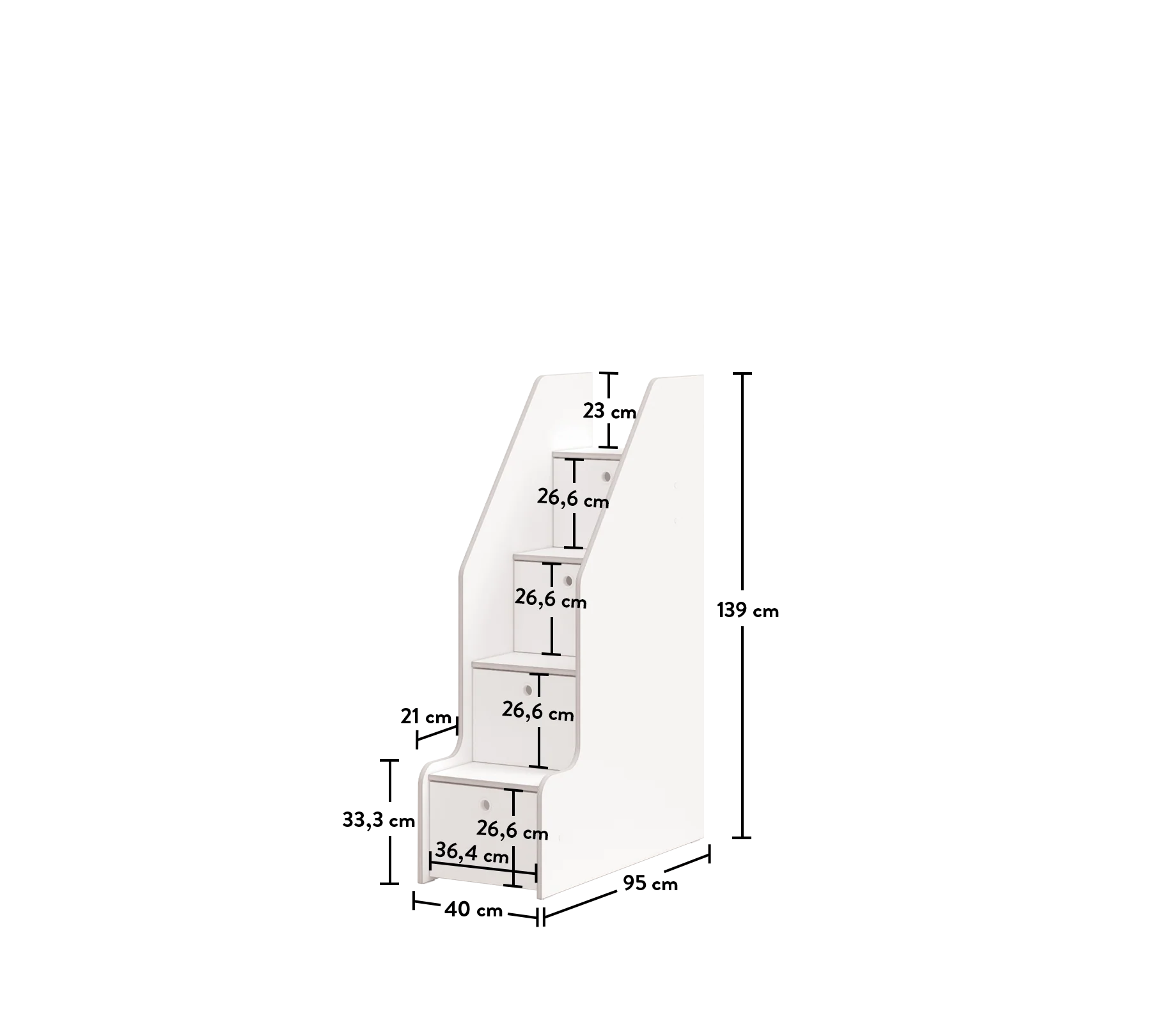 Treppe aus der Serie Studio von Cilek kann sowohl als Aufstiegsmöglichkeit für das Etagenbett als auch platzsparendes Regal mit viel Stauraum genutzt werden. Dank vier großen Ablagefächern schaffen Sie schnell und einfach Ordnung in Ihrem Zimmer.