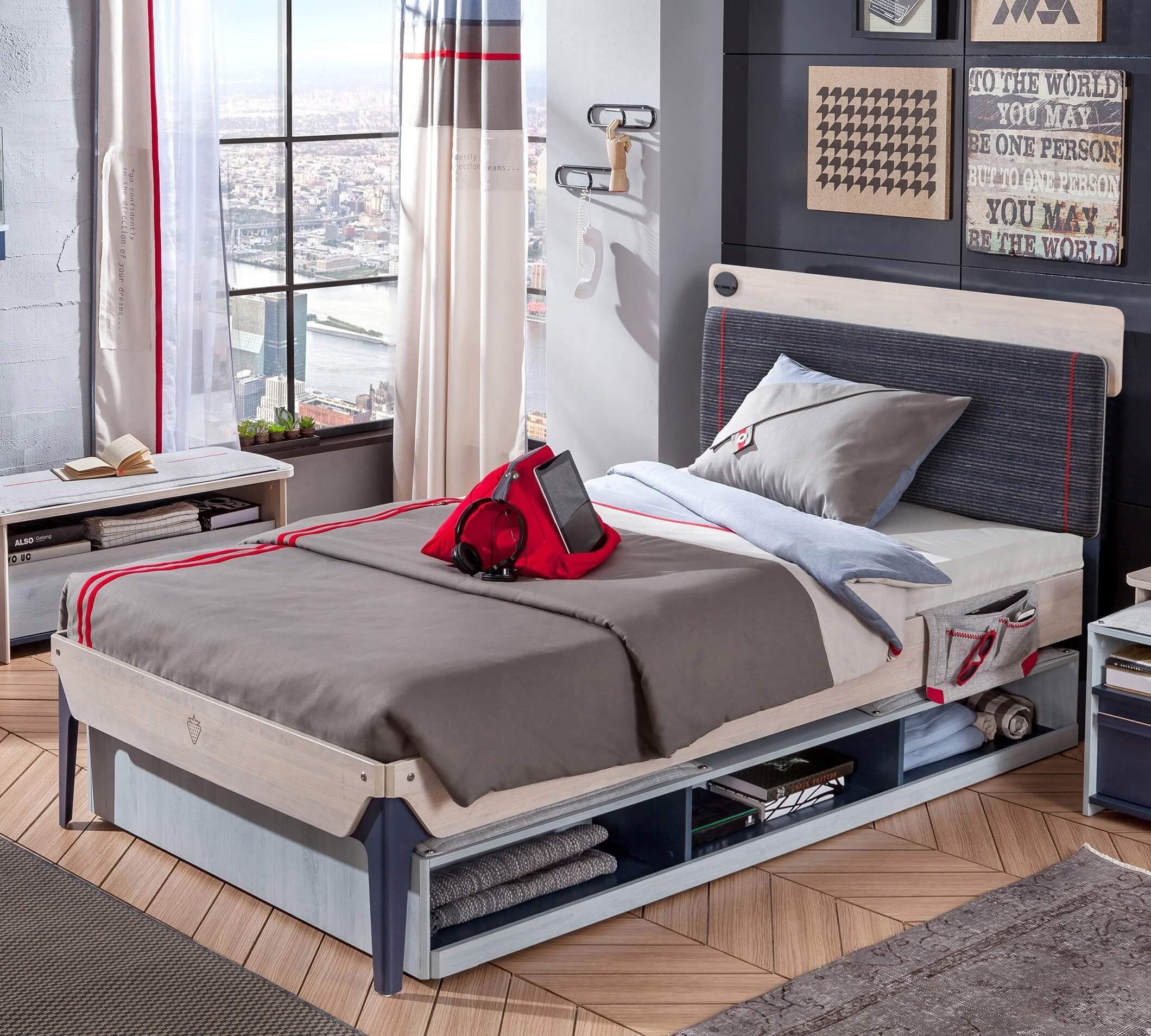 Das TRIO Bett hat ein eingebautes Regal am Kopfende. Das Regal kann z.B. ein Nachtisch ersetzen. USB Anschluß am Kopfende hat zwei Ausgänge, somit können zwei Geräte auf einmal aufgeladen werden. Praktische Butler-Tasche an der Seite ist verstellbar und bietet Platz für alles, was Sie über die Nacht brauchen könnten.
